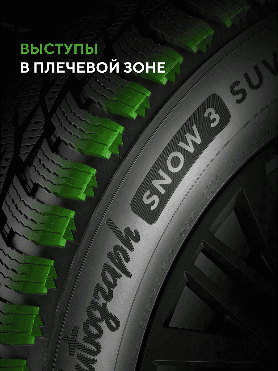 Точное управление на снегу достигается благодаря «снежным когтям», расположенным между шашками протектора и плечевыми зонами.